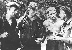 actions on the mainland of Europe.On sunday the 17th of September the major part of the troop came in to action during operation Market Garden. 11 commando's of the troop were assigned to the 82nd US Airborne Division, 5 to the 101st US Airborne Division, 3 to the staff of 1st British Airborne Corps and 12 commando's were assigned to the British 1st Airborne Division. 2 of them crash landed in Gliders in the southern part of the Netherlands and 4 of them were taken prisoner after landing. The names of the remaining party which came in to action at Oosterbeek/Arnhem were: M.J. Knottenbelt, M. van Barneveld, A.H.T. Italiaander, A.J.P. Beekmeier, C. Helleman, A. Wolters and M. Bakhuis-Roozeboom (killed). During the battle Dutch volunteers were recruted by Lieutenant-Commander Arnoldus Wolters and Lieutenant Maarten Knottenbelt, two of the Dutch officers attached to the 1st Airborne Division. Only four of these recruits were found to be members of Dutch resistance groups. Three active Dutch volunteers photographed at Hartenstein Oosterbeek on 19 September with Dutch Commando August M. Bakhuis-Roozeboom. Bakhuis-Roozeboom would be killed on the same night while on a Jeep patrol to Arnhem with two volunteers; Beekhuizen and Diepenveen, and was buried in the Hartenstein area. He was reinterred in Oosterbeek as an unknown soldier from a Canadian regiment. His grave was identified in 1996. The other 3 men on this photo have never been identified. It is said one (left with cap) was a farmer from Elst or Driel who came to Oosterbeek with the Driel ferry. Second left is believed to be a KP man from Arnhem, he came armed with a Russian Machine Gun. |